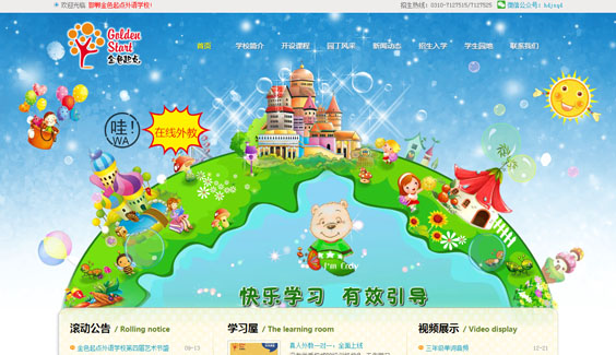 負責邯鄲市金色起點外語學校網(wǎng)站設計制作開發(fā)等網(wǎng)站建設服務,金色起點是一所面向兒童的外語高級培訓學校,故網(wǎng)站設計時注重活潑、可愛、時尚等特點,金色起點網(wǎng)站設計以藍色為主打系,黃色為輔助色系,采用先進的動態(tài)flash技術使整個網(wǎng)站生動、形象、活潑等,結(jié)合學校的特點,以黃色為點輟,襯托年輕、成長、可愛的的學習畫卷。