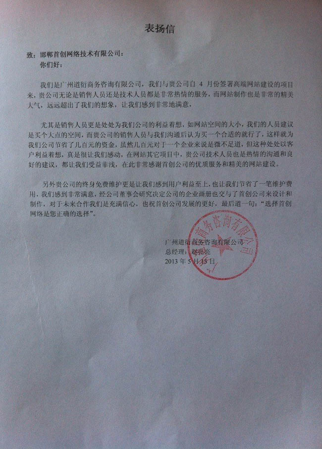 日前,我公司收到道衍商務(wù)咨詢有限公司的表?yè)P(yáng)信,在信中對(duì)首創(chuàng)公司的網(wǎng)站建設(shè)和服務(wù)給予了充分肯定和表?yè)P(yáng)。我們也感謝道衍公司的表?yè)P(yáng),我們會(huì)繼續(xù)堅(jiān)持為新老客戶提供優(yōu)質(zhì)的服務(wù),也希望在未來的道路上,與道衍公司合作的更加完好。